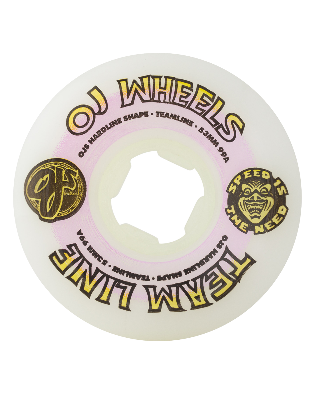 OJ Wheels new 53mm Team Line Hardline with classic inspired graphics and Team Line 99a urethane in a natural white color.
